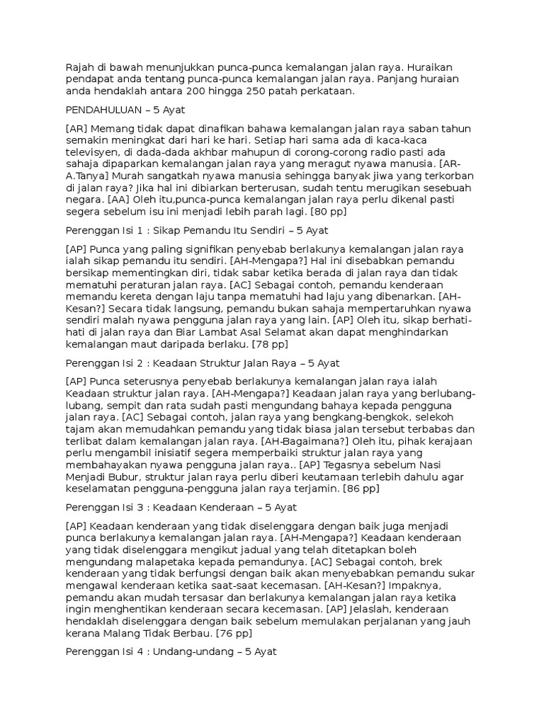 Punca-Punca Kemalangan Jalan Raya. Langkah memupuk keselamatan jalan raya Huraian ayat dalam setiap perenggan sekurang-kurangnya 5 ayat lengkap Penutup 4 ayat seperti biasa Pilihan Kedua. Hal ini dikatakan demikian kerana kes kemalangan jalan raya telah mencatatkan sebagai pembunuh kelima di Malaysia selapas penyakit jantung dah kencing manis.