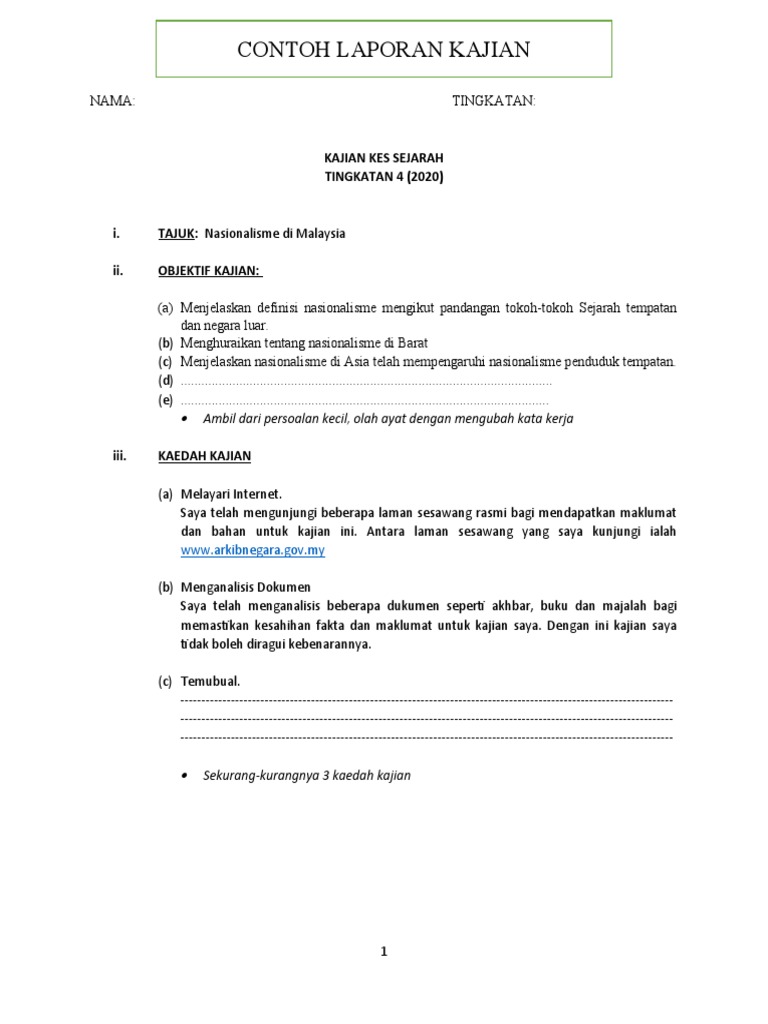 Contoh Laporan Kajian Kes Sejarah Tingkatan 4. Pelajar perlu menjelaskan memperkenalkan latar belakang tempat kajian lokasi berdasarkan kepada keadaan serta situasi terkini. Contoh Objektif Kajian Kes Sejarah Tingkatan 4.