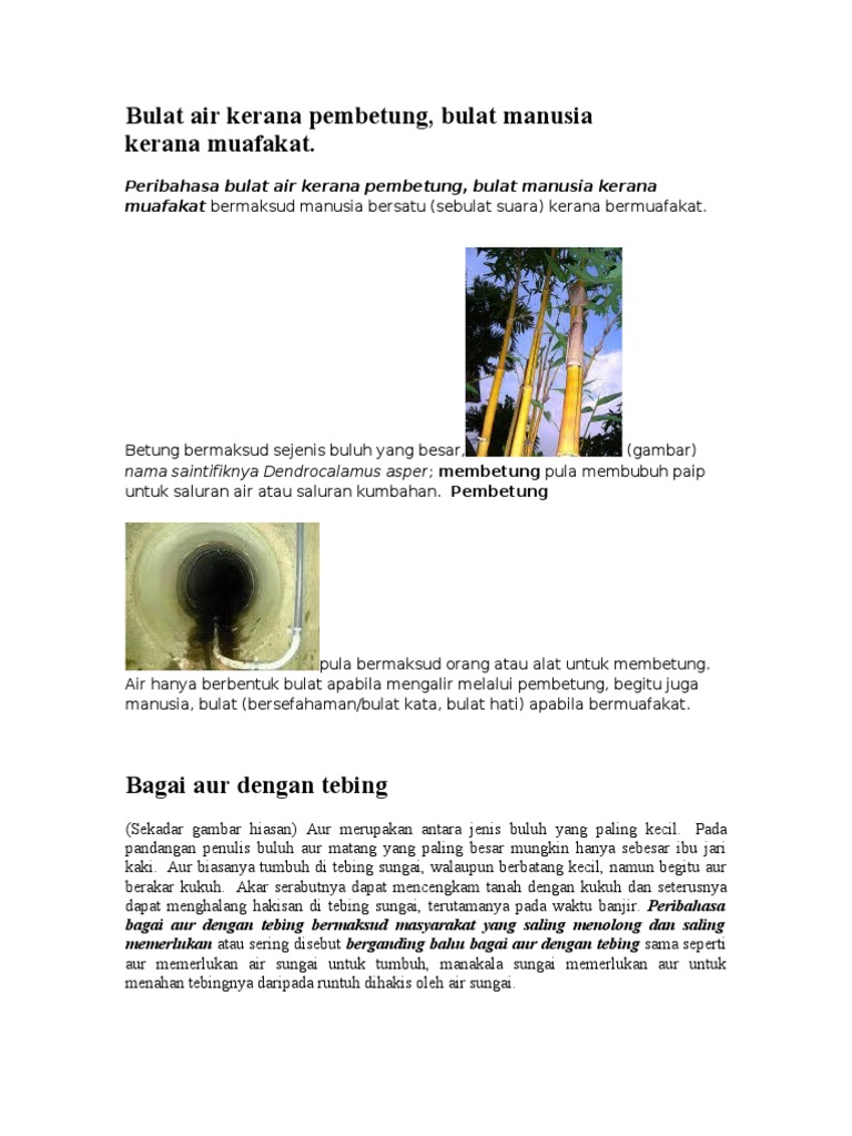 Bulat air kerana pembetung bulat manusia kerana muafakat. Contoh ayat bulat air kerana pembetung yang paling ringkas. Seperti aur menggunakan tebing untuk tumbuh di atasnya manakala tebing tetap wujud jika ada aur yang tumbuh di atasnya.