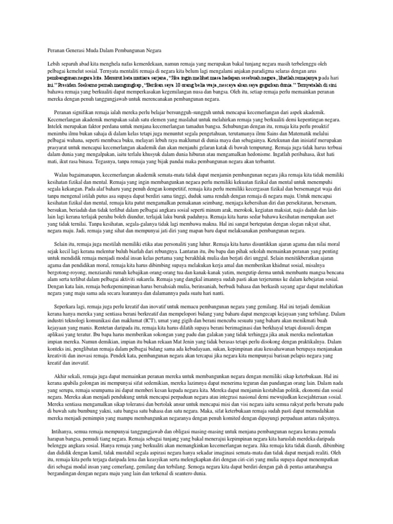 Peranan remaja dalam pembangunan negara karangan spm for more information and source see on this link. 117520939 Peran Pemuda Dalam Pembangunan Nasional. Ternyata mentaliti remaja di negara kita belum lagi mengalami anjakan paradigma selaras dengan arus pembangunan negara kita.