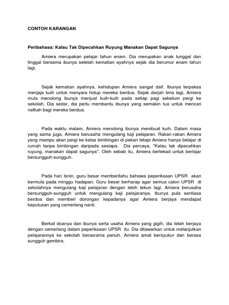Contoh Karangan Peribahasa Huraian Tuliskan sebuah karangan berdasarkan peribahasa Bersatu Teguh Bercerai Roboh. Jangan Sudah Terhantuk Baru Terngadah. Di mana ada kemahuan di situ ada jalan.