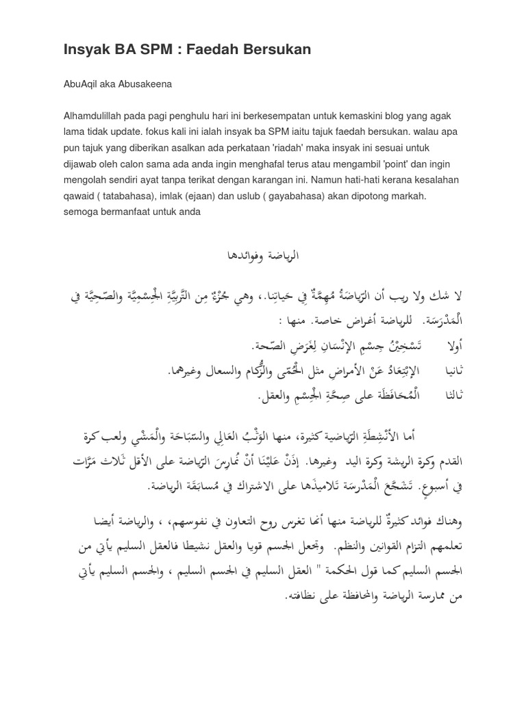 Sewaktu sambutan hari raya aidilfitri yang lalu anda telah mengunjungi rumah terbuka yang dianjurkan oleh kerajaan malaysia. Contoh karangan insyak. Insyak Kepentingan Tolong menolong أهمية التعاون Insyak SPM.