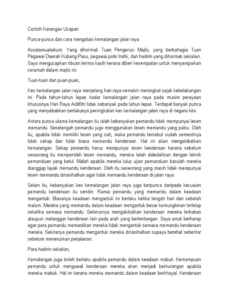 Contoh Karangan Ucapan Punca Punca Dan Cara Karangan Ucapan Punca Punca Dan Cara Mengatasi Kemalangan Jalan Raya Assalamualaikum Yang Dihormati Tuan Pengerusi Majlis Yang Berbahagia Pdf Document. Negara kita juga dikatakan sebagai sebuah negara yang mempunyai kadar kemalangan jalan raya. Langkah-langkah untuk mengatasi masalah ini ialah.