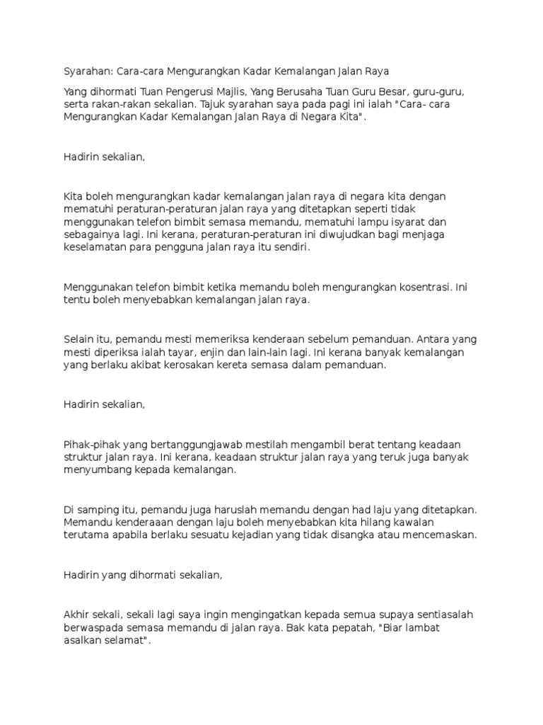 Contoh karangan syarahan tentang cara cara mengatasi kemalangan jalan raya. Terima kasih cikguSyarahan ini membuat saya senang nak belajarSaya sangat sangat sangat. CONTOH KARANGAN SPM USAHA-USAHA MENGURANGKAN KADAR KEMALANGAN JALAN RAYA DI MALAYSIA. Hadirin sekalian Kita boleh mengurangkan kadar kemalangan jalan raya di negara kita dengan mematuhi peraturan-peraturan jalan raya yang ditetapkan seperti tidak menggunakan telefon bimbit semasa memandu mematuhi lampu isyarat dan sebagainya lagi.