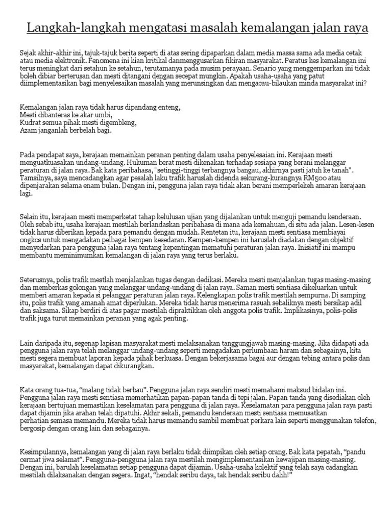Contoh karangan kemalangan jalan raya tingkatan 1. Paparan kemalangan jalan raya di televisyen dan surat khabar jelas menunjukkan bahawa kadar kemalangan jalan raya semakin meningkat setiap tahun. Kenderaan Diselenggara dengan Baik.