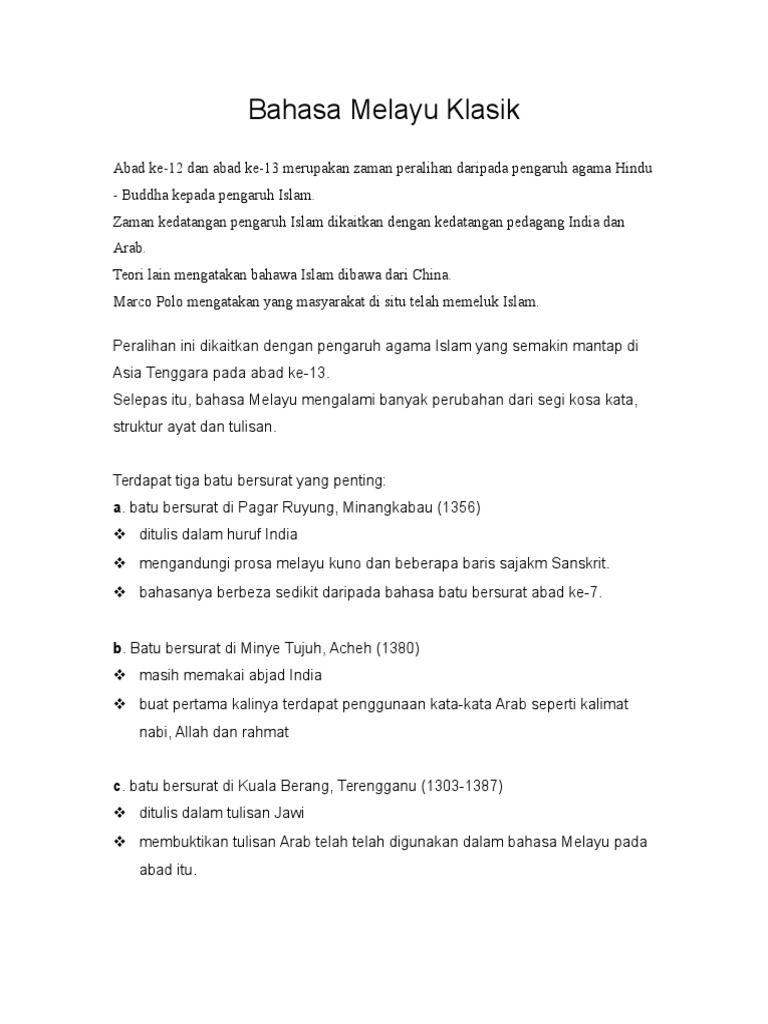 I dan III C. Sangulun سڦولن Jw Makna. Terdapat tiga ciri bahasa melayu klasik iaitu tatabahasa kosa kata dan sistem tulisan dan ejaan.