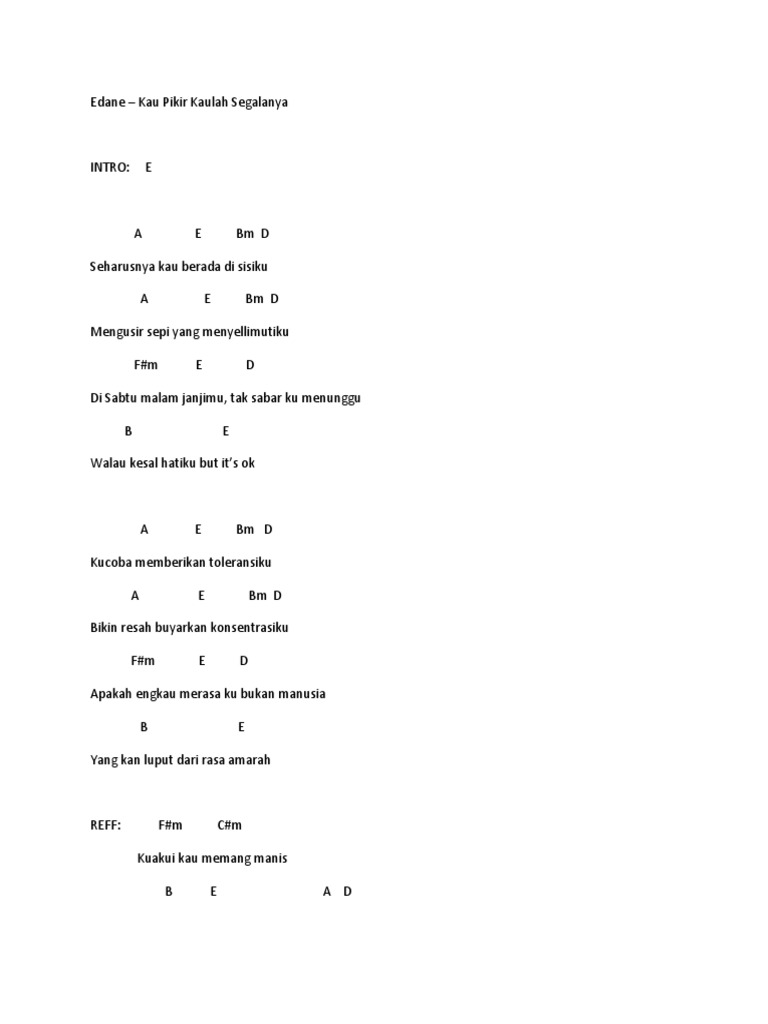 Chord Kaulah Segalanya Intro A F Em Dm C C7 Verse F Am Mungkin hanya Tuhan A7 Dm Yang tahu sgalanya A Am Dm Apa yang kuinginkan A C Di saat-saat ini F Am Kau takkan percaya A7 Dm Kau slalu di hati A Am Dm Haruskah kumenangis Gm C Tuk menyatakan yang sesungguhnya Chorus F Am Dm Kaulah segalanya untukku C F -E. Mungkin hanya Tuhan yang tahu segalanya. Berjanji dengan pasti Gm Cm Kita hanya merancang Gm C D Gm Tuhan yang menentukan Cm F Jangan kau salah mengerti B Gm Dengan pengakuan ini E D Usah disalah tafsirkan Gm G Bukan ku tak sayang Cm F Ku mahu kau menginsafi B Gm Dengan kehidupan ini E D Segala berkemungkinan.