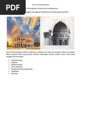 TAMADUN DUNIA DAN SUMBANGANNYA Reka bentuk seni bina Colosseum Tamadun Rom menjadi asas kepada idea pembinaan stadium pada masa kini. Kaedah kajian seni bina tamadun rom. Video ini menerangkan kajian kes sejarah tingkatan 1 bahagian a perancangan dalam pelaksanaan kajian kes sejarah.