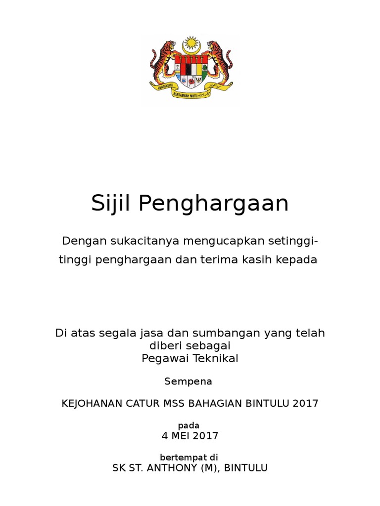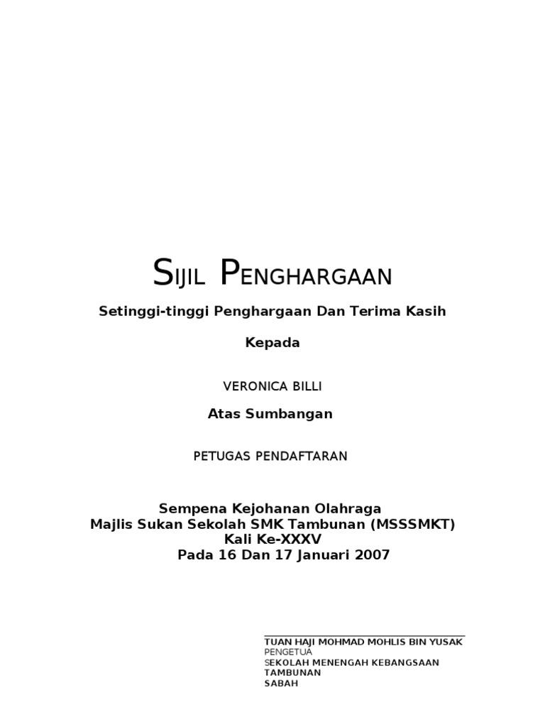 Sempena Kejohanan Olahraga Majlis Sukan Sekolah SMK Tambunan MSSSMKT Kali Ke-XXXV Pada 16 Dan 17 Januari 2007. Contoh Sijil Penghargaan Khidmat Cemerlang. Please fill this form we will try to respond as soon as possible.