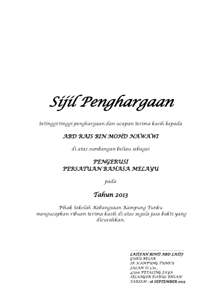 Contoh sijil penghargaan dan terima kasih. Posted by m rodz at 124 AM. Majlis seterusnya menjemput guru besar SKDB Encik Haji Ali bin Haji Abu untuk penyampaian hadiah yang seterusnya iaitu penyampaian anugerah pelajar terbaik mengikut mata pelajaran. Sekolah menengah kementerian pelajaran jalan menara 123456 kuala lumpur.