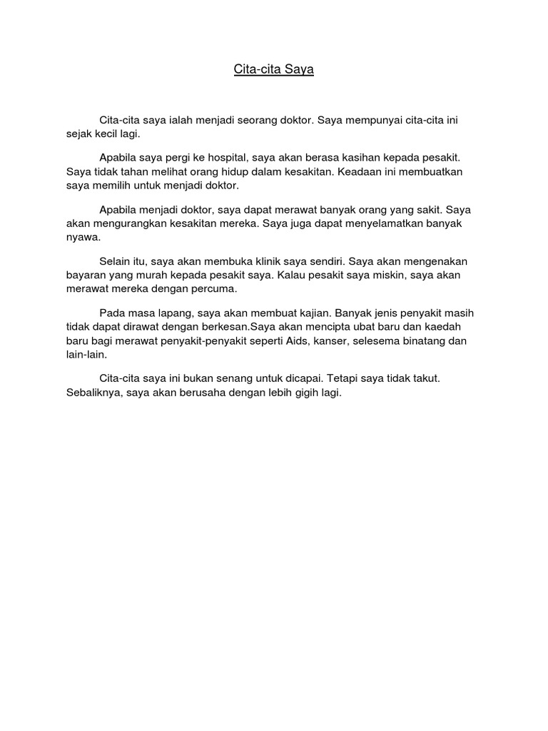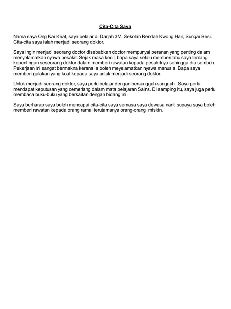 Saya perlu merawat pesakit dan memastikan mereka sembuh dengan sempurna. Ketika saya mberada di tingkatan 3 cita-cita saya adalah untuk menjadi seorang chemical engineer entah apa motif aku pon tak tahu. Tajuk Cita cita Saya Semua orang mempunyai cita-citabegitu juga dengan sayaSaya bercita-cita ingin menjadi seorang doktor suatu hari nanti.