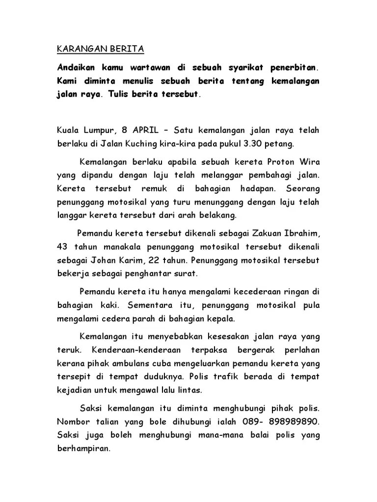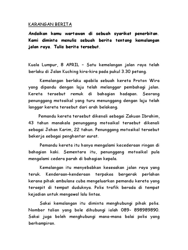 Ketika menulis karangan jenis ini anda diperlu memikirkan lima persoalan iaitu apa siapa bila di mana dan mengapa. Kemalangan Di Jalan Raya Rembau14 April - Satu kemalangan ngeri telah berlaku di Kilometer 2308Lebuh Raya Utara - Selatandekat sinihari iniPemandu kereta ituBarhan Hakimi mengalami cedera parah setelah kereta yang dinaiki bersama isterinya terlibat didalam kemalangan. Kemalangan jalan raya yang melibatkan penunggang motorsikal juga banyak dilaporkan dan meragut nyawa mangsa.