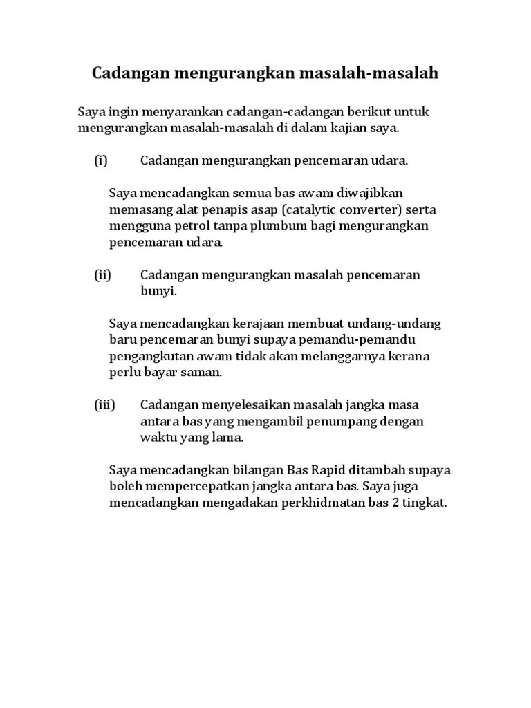 Antara cadangan yang boleh diambil untuk mengurangkan masalah pengangkutan awam ialah. Melalui pemerhatian saya dapati bahawa pengangkutan awam telah meningkatkat pencemaran udaradi kawasan kajianLebih-lebih lagi pengangkutan awam bas menggunakan minyak diesel yang menyebabkan bas mengelurkan asap yang lebih banyak. Laporan dapatan kajian calon mestilah dikaitkan dengan kaedah kajian apa-apa maklumat yang anda huraikan mesti dinyatakan sumberkaedahnya sekurang-kurangnya.